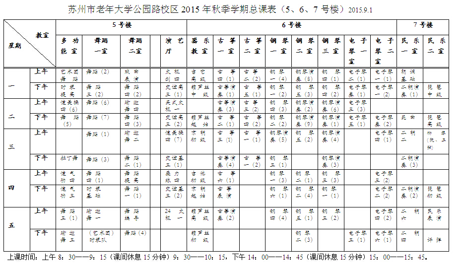 苏州市老年大学公园路校区2015年秋季学期总课表(5、6、7号楼)