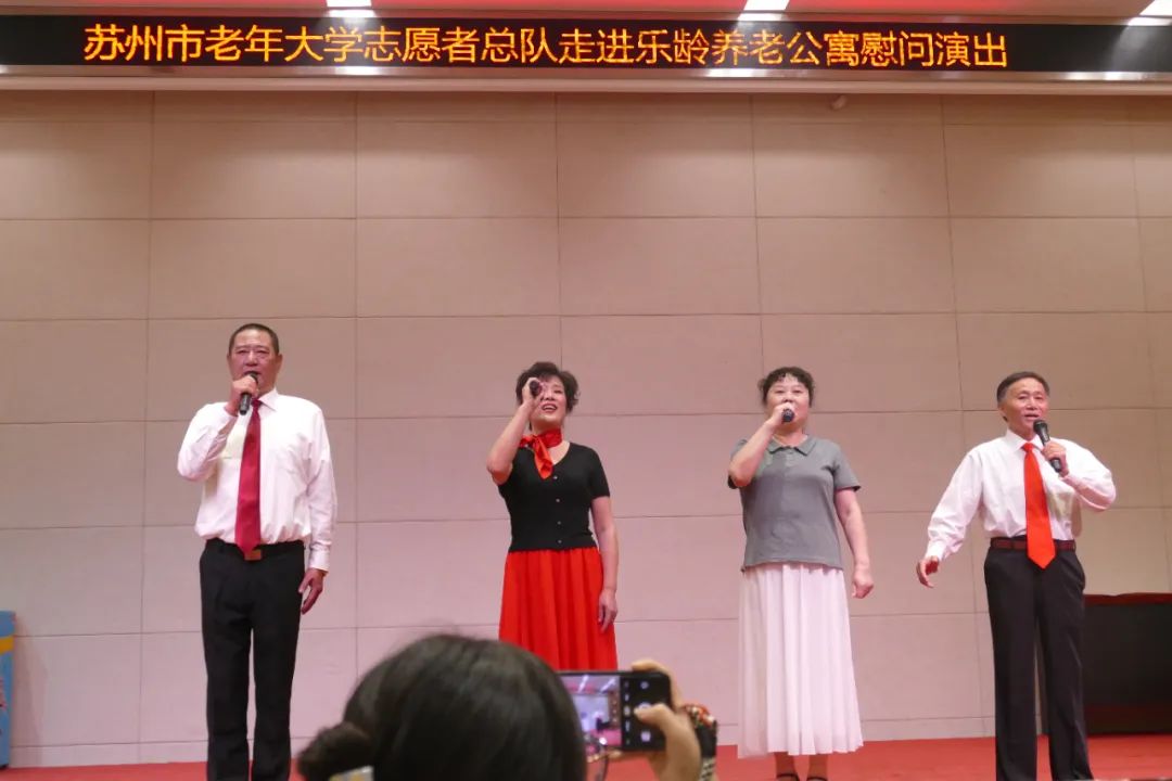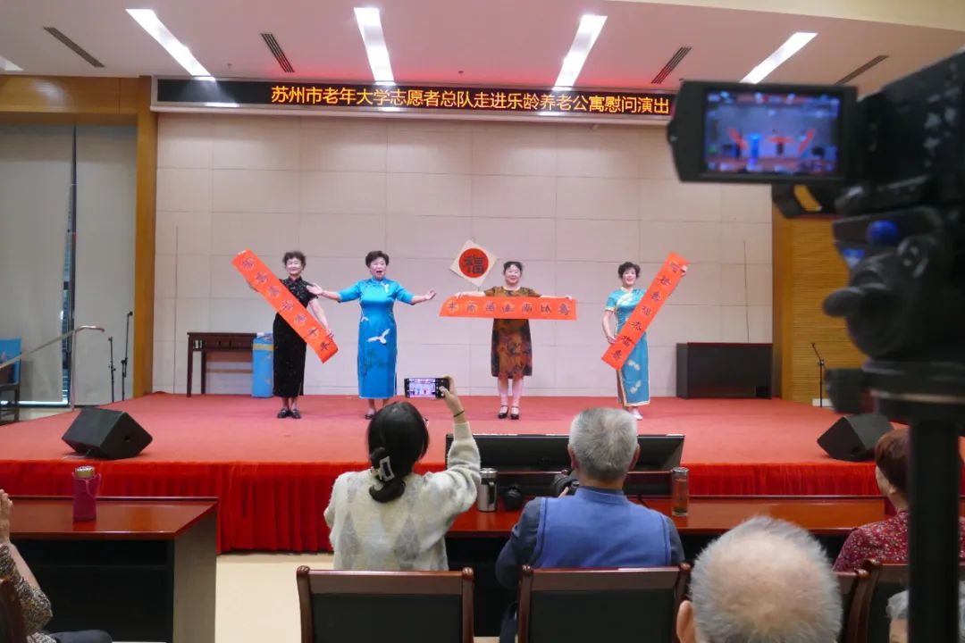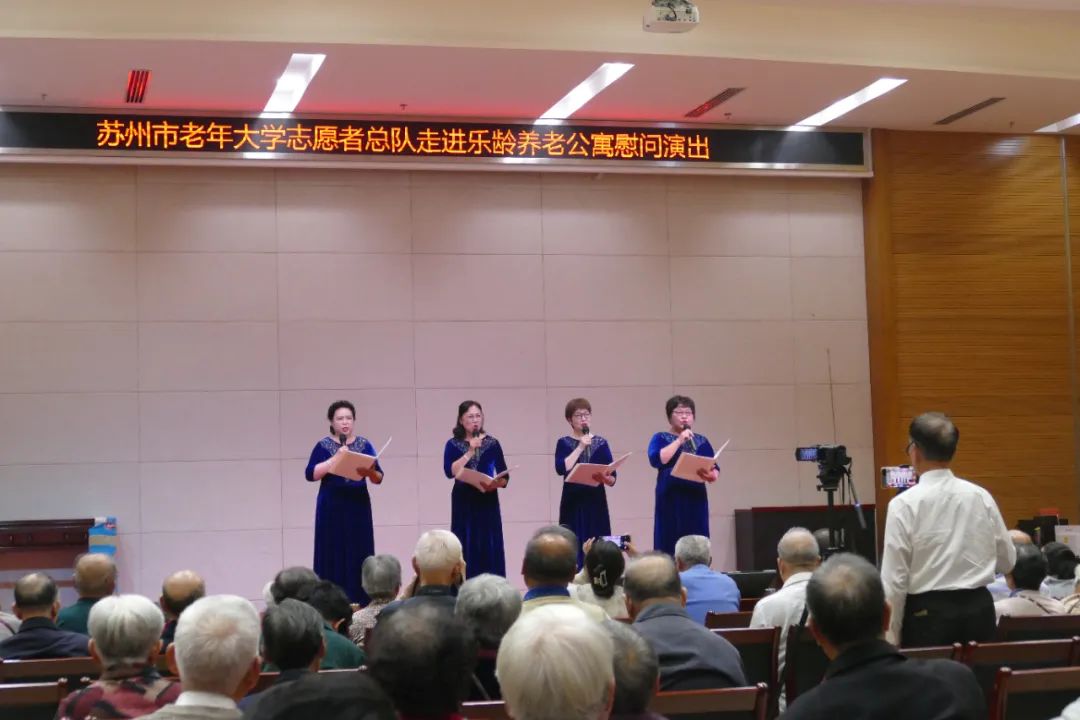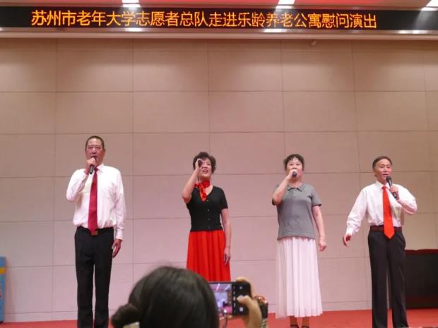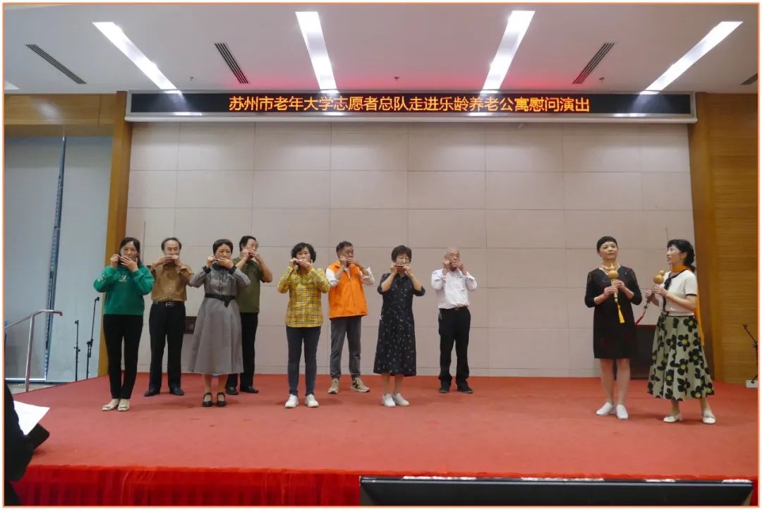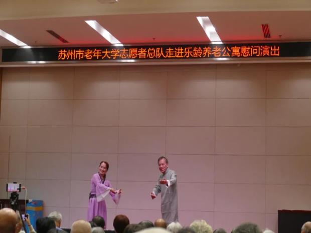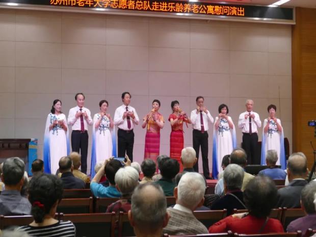 在第75个重阳节来临之际,我们苏州市老年大学学联会和志愿者总队受学校委托,于十月十六日在学工处沈鸿秋主任的带领下,怀着尊老、爱老、敬老和助老的热情,如约前往吴江乐龄老年公寓送祝贺、送温暖,作重阳节的慰问演出。