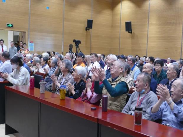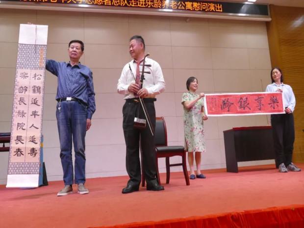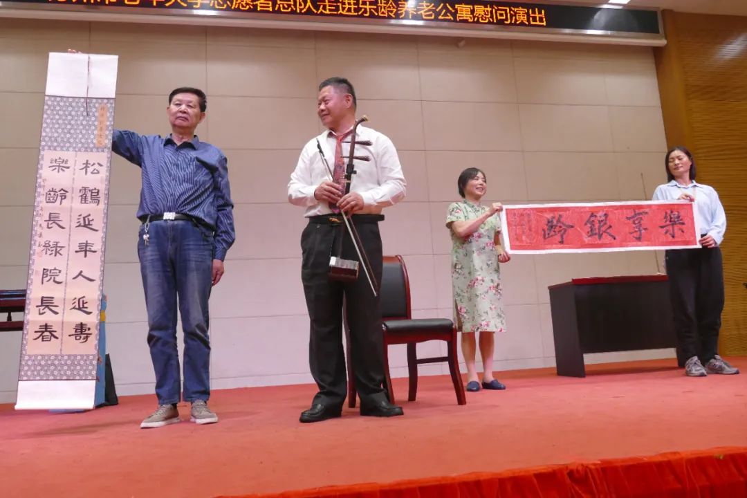 学联会秘书长赵伏山演奏二胡曲《渭水秋歌》时,两位书法高手即兴奋笔,从手指到琴弦,从字体到笔锋交相呼应,曲终字毕;李新新的“乐享银龄”,马怀玉的“松鹤延年人延寿、乐龄长绿院长春”条幅展示后,博得长者们的点头称赞,纷纷举起手机拍照留念。