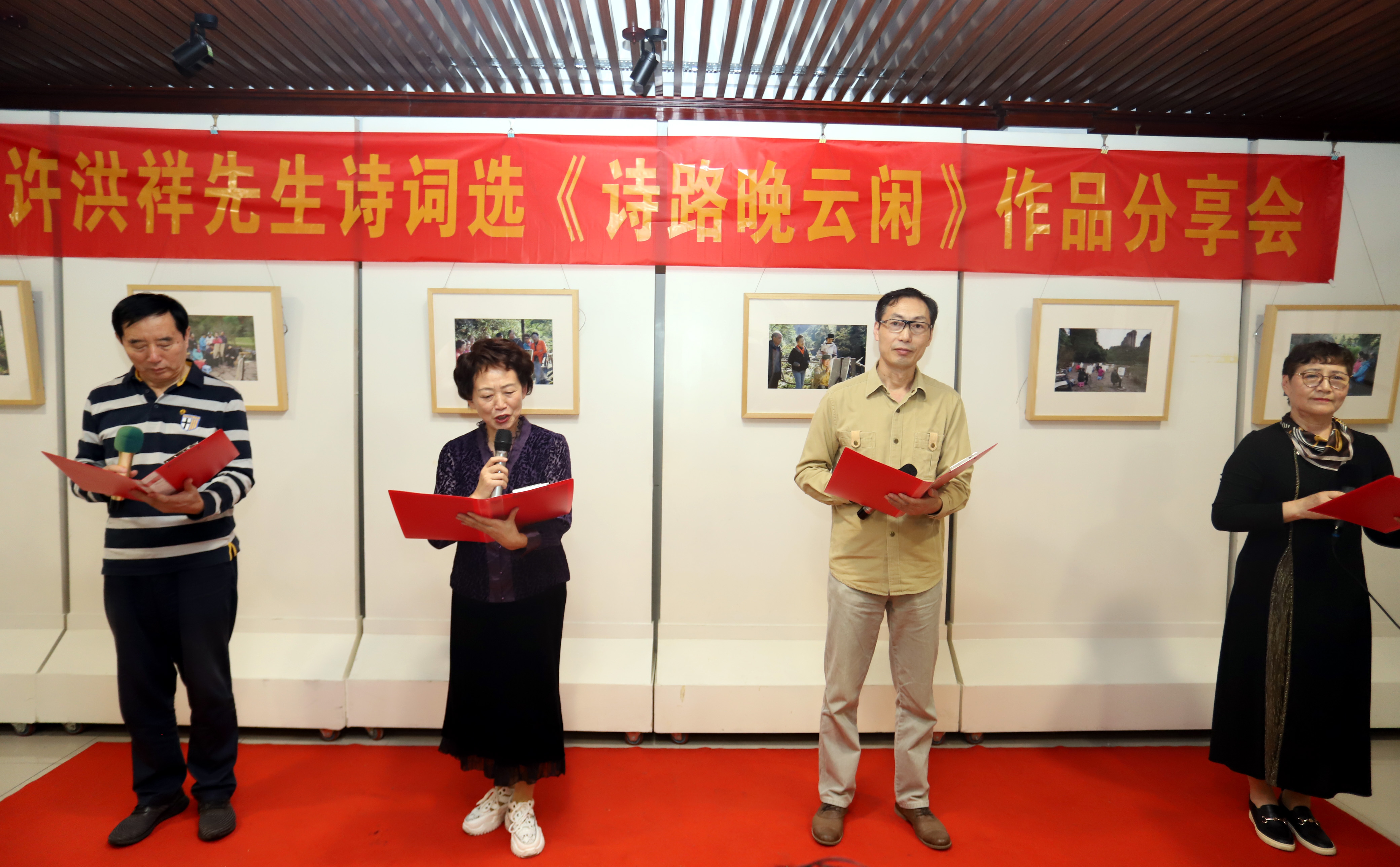 新书签名环节后,学员在朱正老师的带领下分享朗诵《诗路晚云闲》 一书中的9首诗词作品。朱正、钟勤华朗诵了“人生”;陈建华朗诵了“沁园春•风卷旗旌”;张言朗诵了“秋之韵”;陈红郦朗诵了“满江红•望江南”;金青朗诵了“迟到的嘱咐”;汪小慧朗诵了“水调歌头•九死亦欣然”;朱春燕朗诵了“水调歌头·明月清风此夜” “江城子·吴中怀旧”;张晓梅、李亚青、朱奕、张晓刚朗诵了“生活的真谛”。许洪祥先生也现场诵读了他刚刚创作的新诗《我爱诵读》,将活动推向高潮。现场诗意盎然、书香弥漫,精彩的朗诵赢得了热烈掌声。学员们纷纷表示,感谢许洪祥先生为大家上了一堂诗词创作心得分享课,进一步激发了自身对朗诵的热爱,特别有意义。