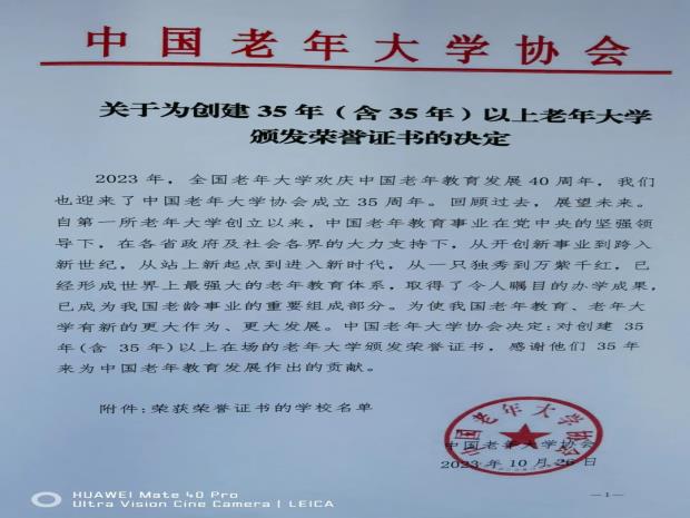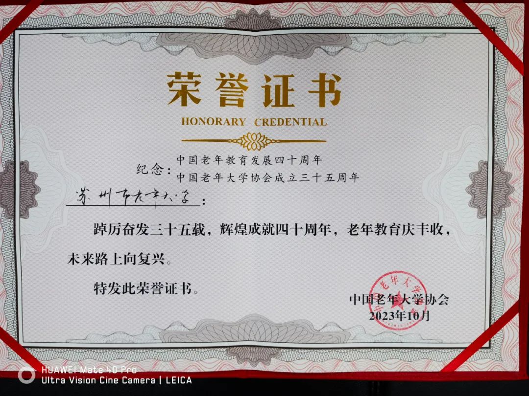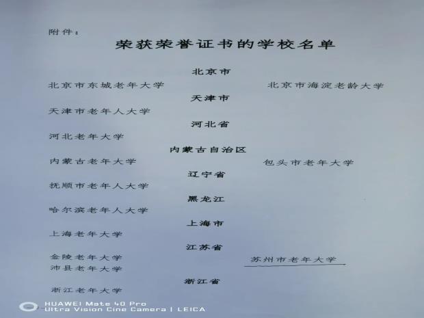 苏州市老年大学获中国老年大学协会荣誉证书
