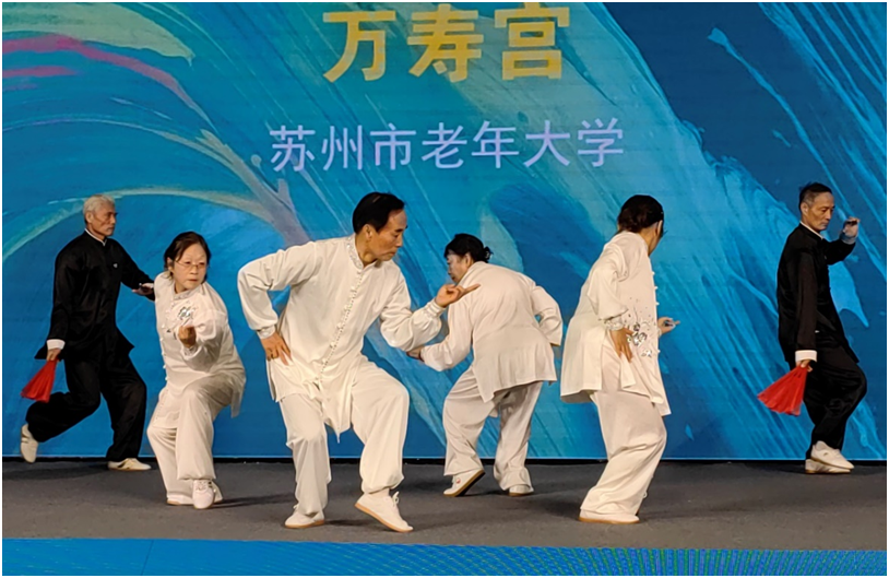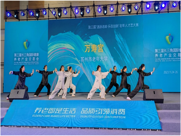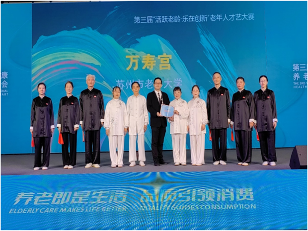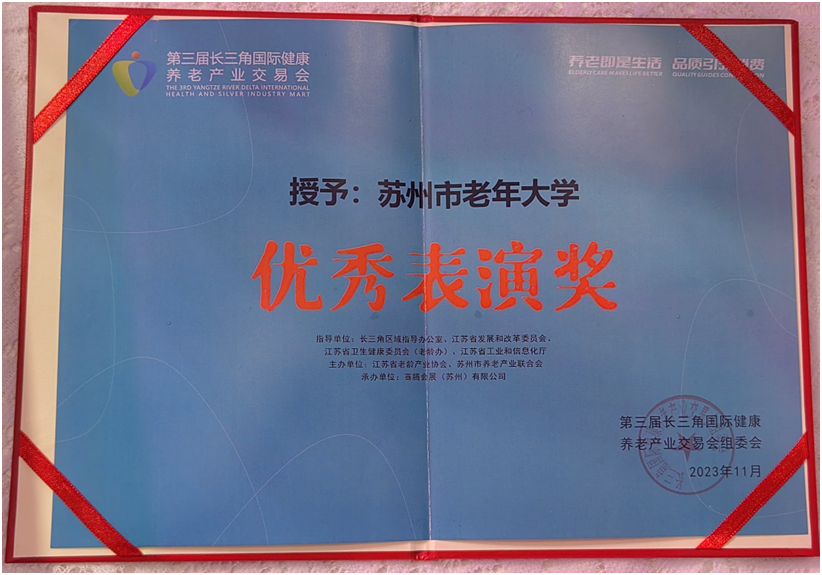 秋高气爽,枫林尽染;促织争鸣,一片阳光。近日,传来一个令人振奋的好消息,由苏州市老年大学太极拳社85式太极拳班学员展演的“‘万寿宫’太极拳组合”节目,荣获了2023年第三届长三角国际健康养老产业交易会的“优秀表演奖”。