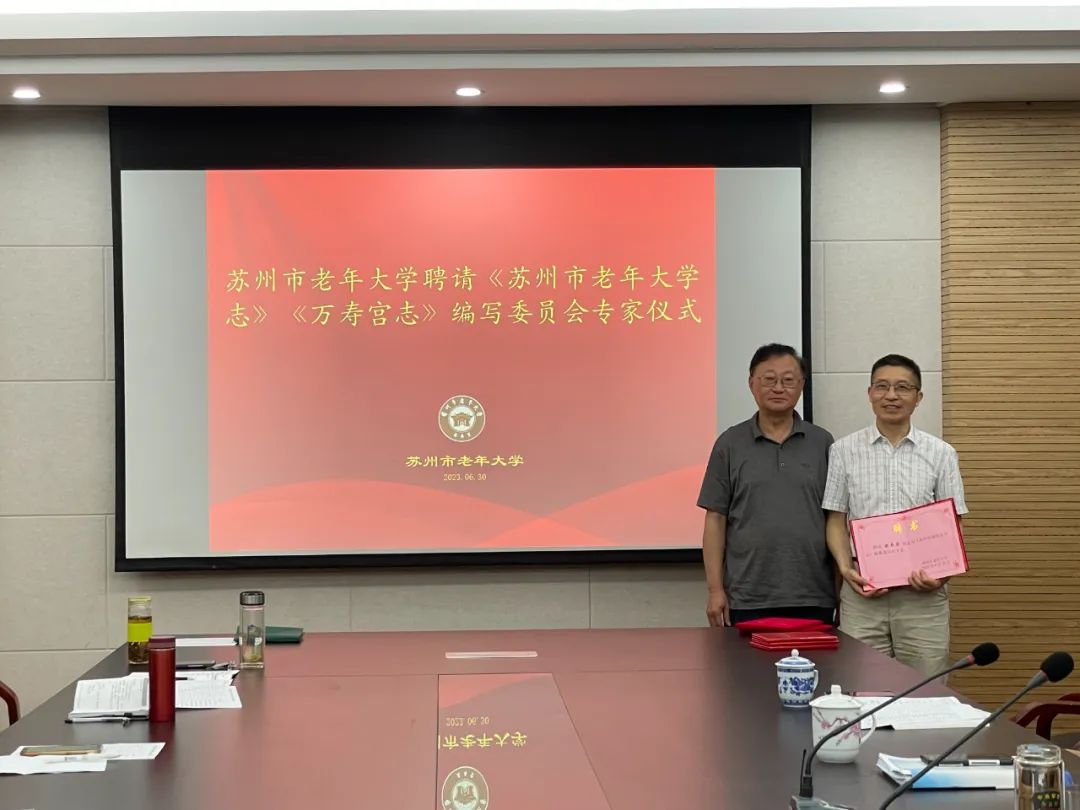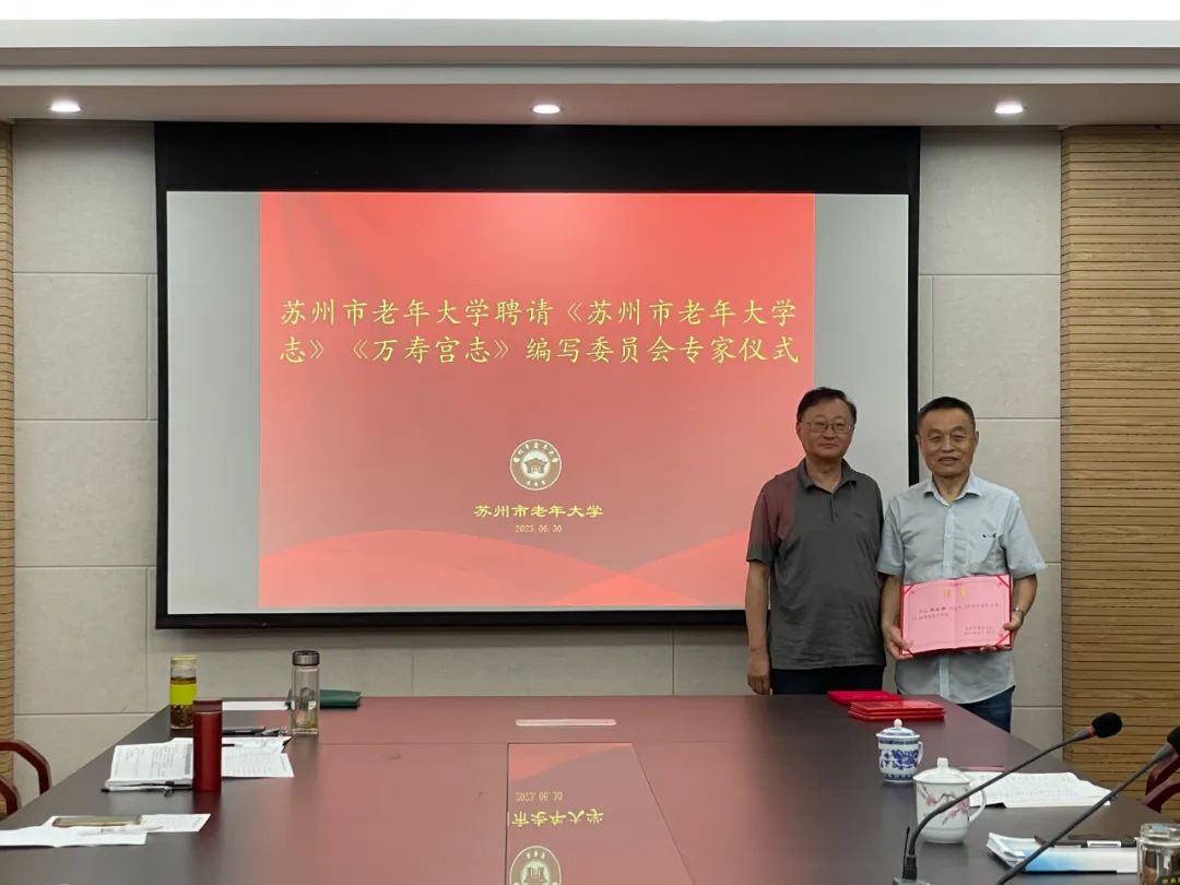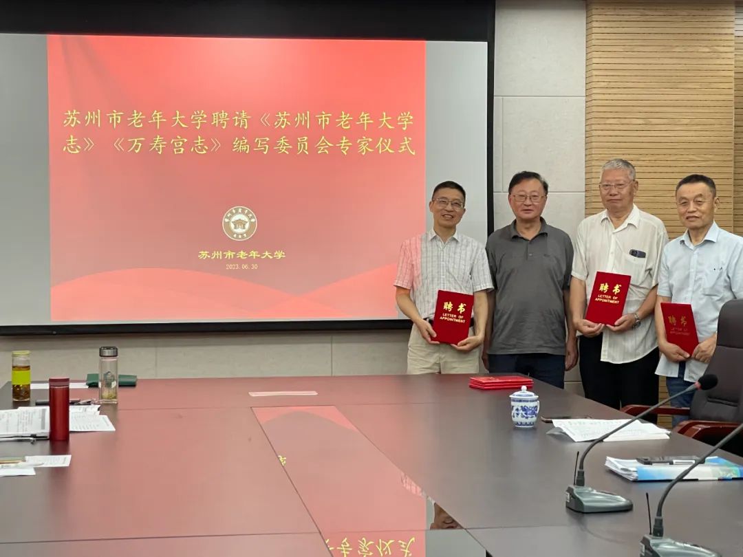 在准备迎接中国老年大学首批标准示范校评估的日子里, 苏州市老年大学启动了编纂《苏州市老年大学校志》工作。聘请苏州市地方志办公室副主任陈其弟及张振雄、谢勤国三位老师担任校志编委会专家。6月30日,学校举行仪式,王少东校长向三位专家颁发了聘书。仪式结束以后,专家们对校志编写的纲目提出了很多宝贵的意见和建议。学校将在此基础上,加快节奏,争取在2025年上半年高质量完成《苏州市老年大学校志》的编写工作。