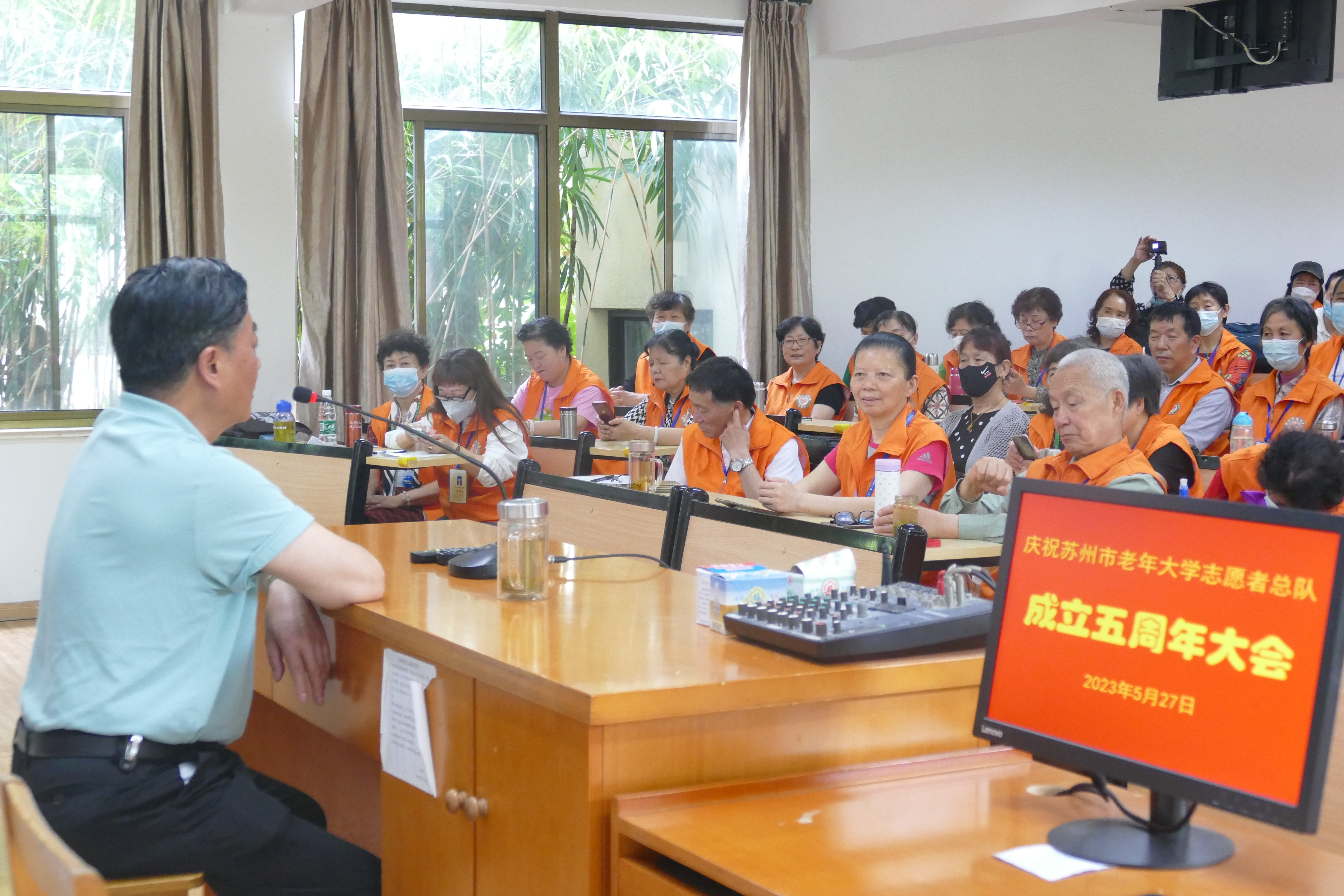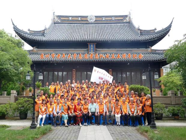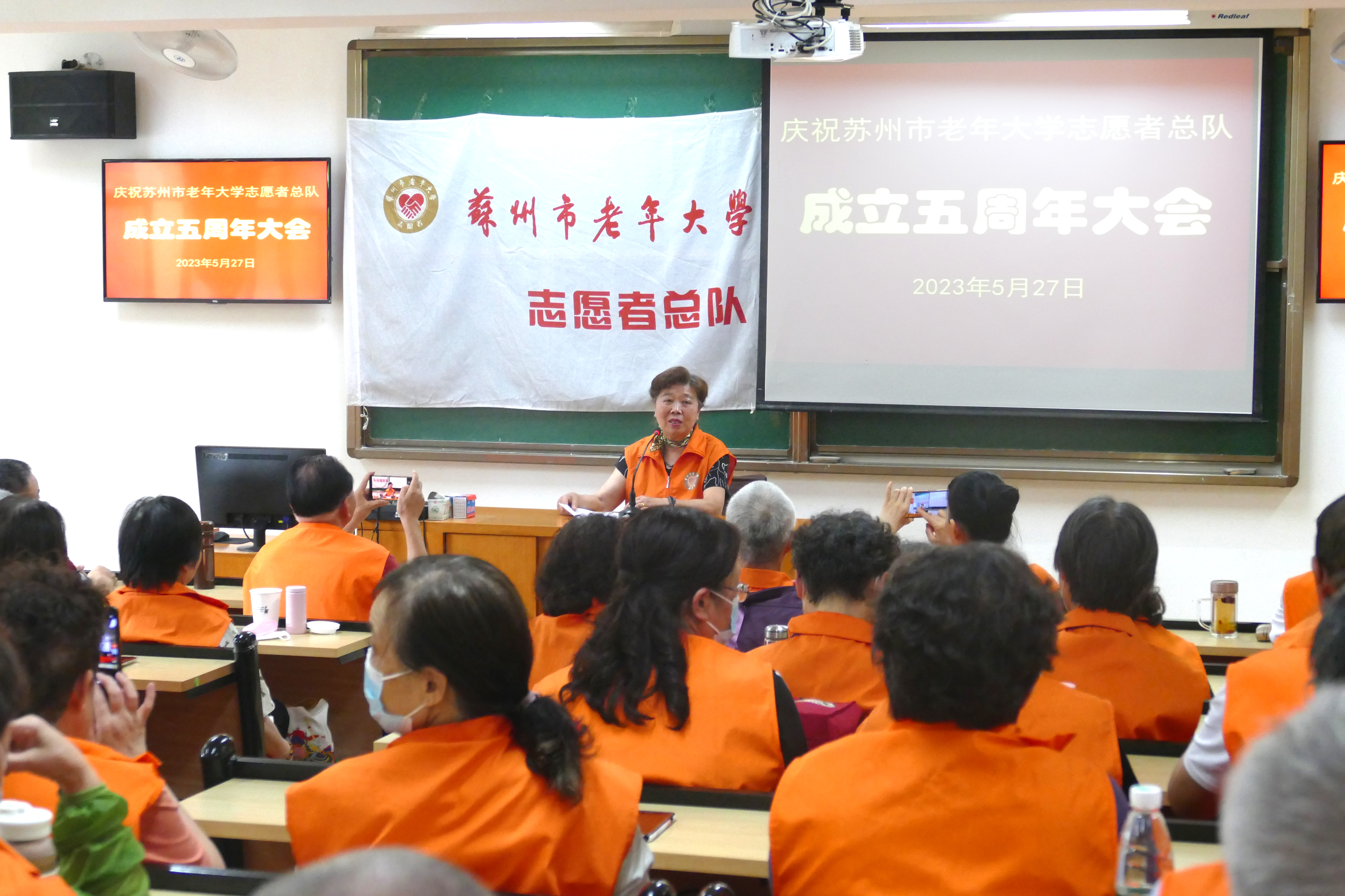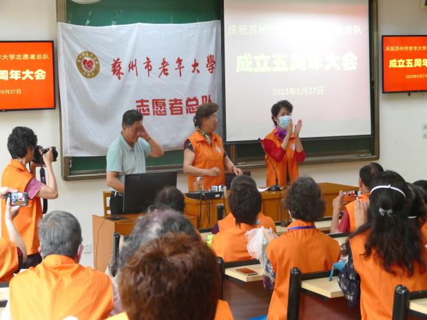 “庆祝苏州市老年大学志愿者总队成立五周年”大会于5月27日上午在3号楼阶梯教室隆重举行。近百名志愿者喜气洋洋,欢聚一堂。庆祝会上,刘建华、陆鸣晓、徐晓梅分别代表各自的小分队作了工作交流和汇报。大队长夏大媛对总队五年的工作作了简单的回顾和总结,并和陆小微副大队长一起向全体志愿者致以节日的问候,鞠躬致谢!