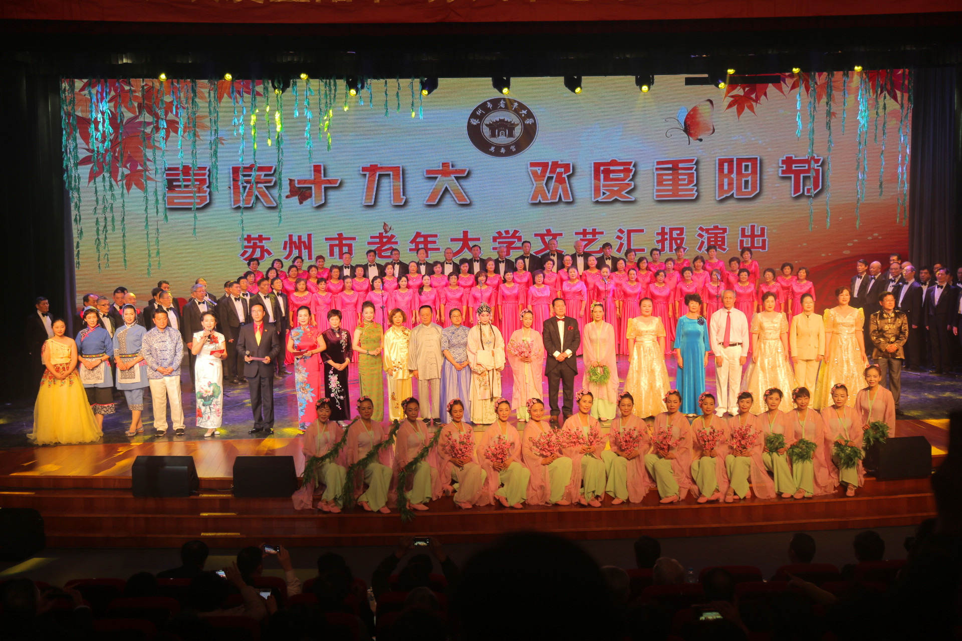 在全国人民热烈庆祝党的十九大胜利召开的喜庆日子里,在第30个老年节即将到来之际,10月21日市老年大学隆重举行“喜庆十九大 欢度重阳节”暨万寿宫300年纪念活动。苏州市委副书记、市老龄委主任朱民,市人大常委会主任陈振一、市政协主席周伟强,市人大常委会副主任顾月华,市政府副市长曹后灵等领导出席纪念仪式。朱民代表市四套班子领导致辞,向全市广大老年朋友、老年教育工作者表示节日的祝贺!向长期关心支持我市老年教育事业发展的社会各界人士表示感谢!朱民充分肯定了苏州近年来老年教育事业取得的重要成绩,老年大学建设事业取得的积极发展,要求各级党委政府在党的十九大精神指引下,积极贯彻落实国务院《老年教育发展规划(2016-2020年)》,适应苏州经济和社会现代化发展需要,适应苏州老龄化人口社会的严峻形势,更大力度推进老年教育事业的新发展。