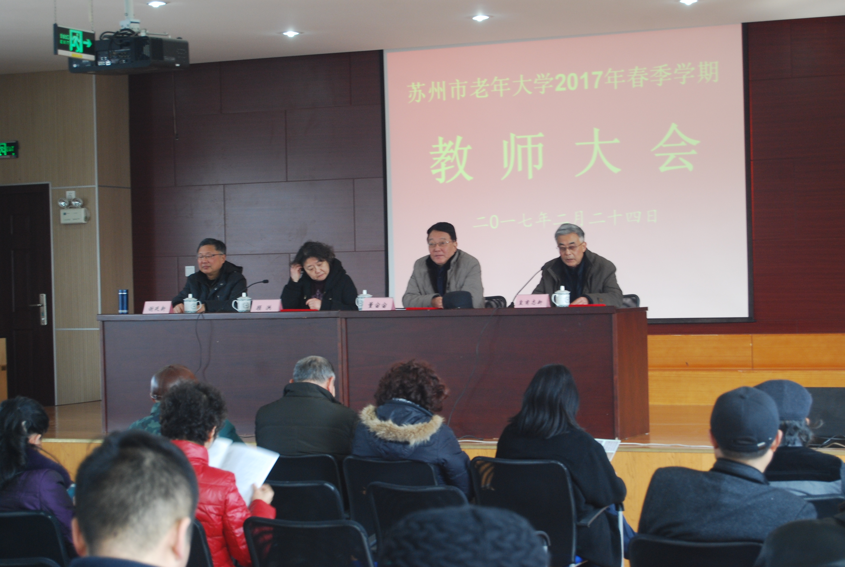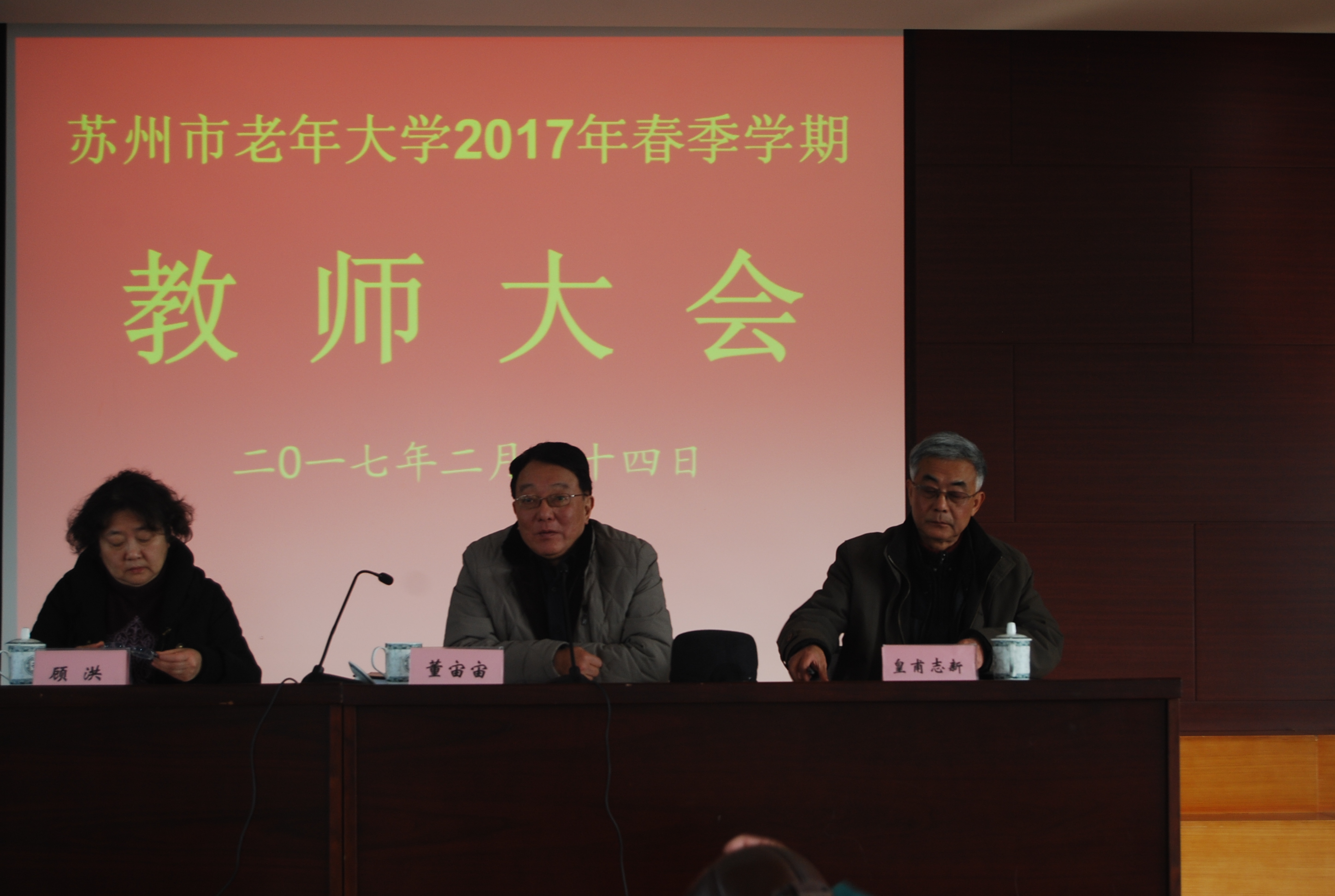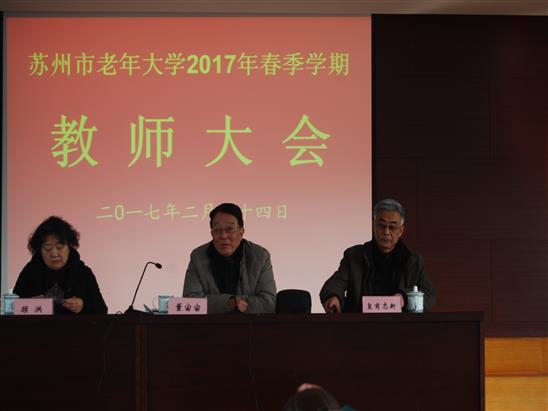 顾洪常务副校长从十个方面总结了学校2016年工作:一、政府支持办学,学校发展再进一步;二、加强内涵建设,争创全国示范老年大学;三、开展理论研究,取得多项成果;四、推进教学改革,提升管理水平;五、广泛开展合作交流,学习先进办学经验;六、亮相国际论坛,宣传办学理念;七、表彰先进师生,弘扬校园正能量;八、支持社团发展,积极服务社会;九、入选全国十所名校;十、加强对外交流,拓展发展视野。2017年工作重点围绕两方面开展:一、本学期按时高质量完成学校第三期改造工程,充分做好开设新课程的前期调研,落实新课程开设的各项准备工作,包括专业设置调整、教师选聘、教材选用、教学设施配备等;二、策划、筹备、组织好万寿宫建宫300周年的系列纪念活动。