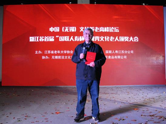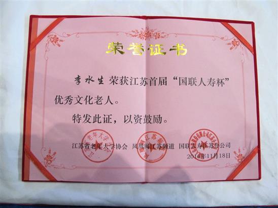 2016年11月18日,由江苏省老年大学协会、凤凰网江苏频道和国联人寿江苏分公司共同主办的中国(无锡)文化养老高峰论坛暨江苏首届“国联人寿杯”优秀文化老人颁奖大会,在无锡太湖国际博览中心召开。我校学员李水生荣获优秀文化老人称号。此次优秀文化老人评选,首先由江苏省老年大学系统推荐100名文化老人,接着组委会根据“在文化艺术创作、历史文化传承方面有突出贡献,并有一定知名度”等评选条件,筛选出30名候选人,最后根据凤凰网投票数选出10名优秀文化老人。 (办公室)