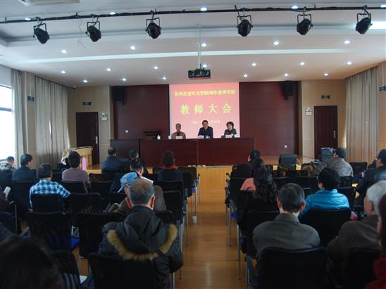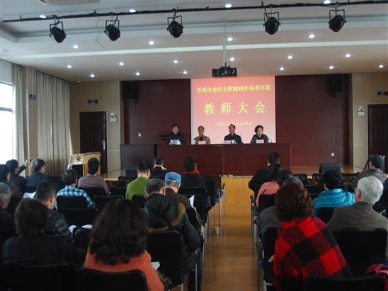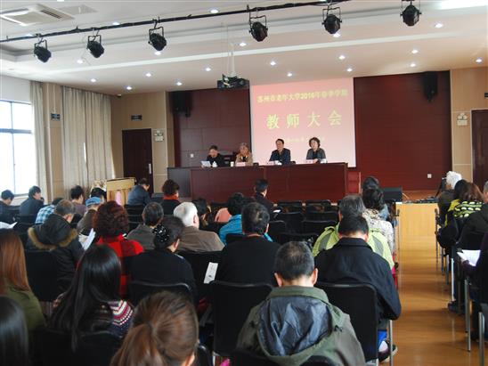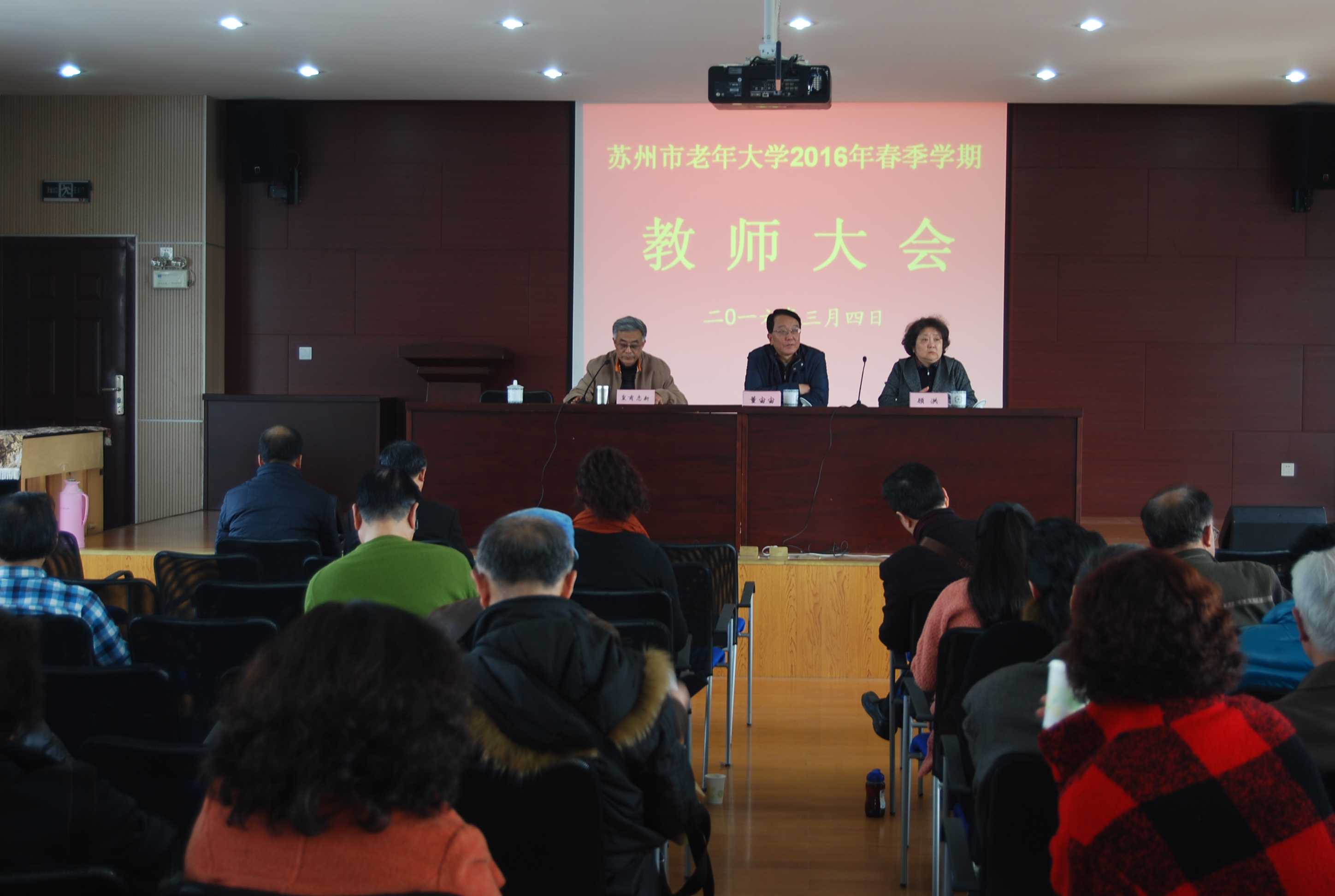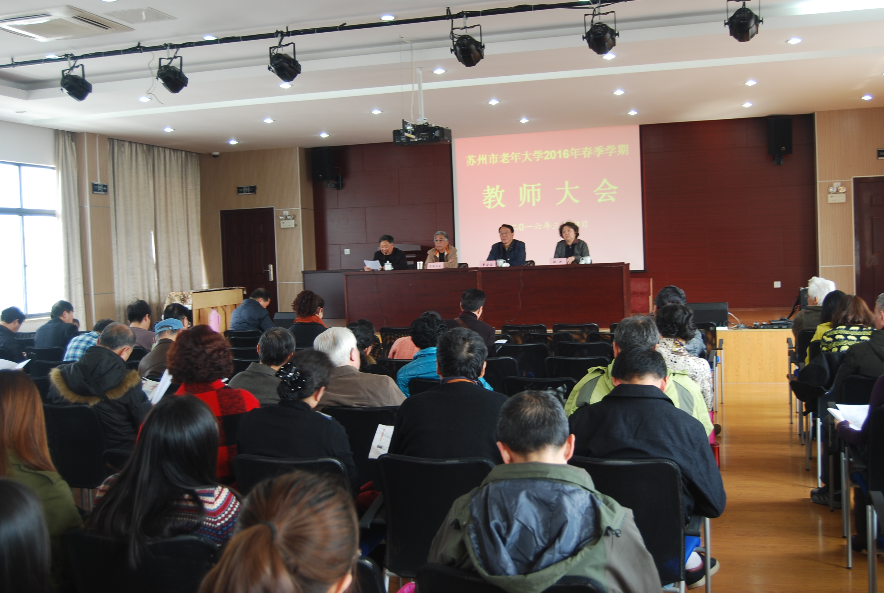 3月4日下午学校在5号楼演艺厅召开2016年春季学期教师大会。首先,顾洪常务副校长回顾总结了学校2015年工作:一、成功举办建校30周年校庆系列活动;二、苏州市万寿宫书画院成立并举行首届书画展;三、苏州市老年大学特聘教授专家团应运而生;四、学校成功入选“全国五个十工程”;五、成功参与2015全民终身学习活动成果展暨首届苏州终身教育博览会;六、首次举办江浙沪中老年时装模特联谊赛;七、继续实施教学改革,提高信息化水平;八、加强理论研究,丰富校园文化;九、政府支持办学,学校发展再逢机遇;十、积极参加有关活动,荣获多项先进荣誉。接着,教师代表王立中老师(人文与社会系唐诗宋词元曲任课教师)作了题为“怎样做一个受欢迎的老年大学教师”的发言,他的体会:一是要认真备课;二是师生要互动,相互交融;三是组织教学要结合社会、贴近生活;四是加强纪律,从我做起。再接着,教务处谢延新主任从四个方面布置了新学期工作:一、完善教学基本功,不断提高课堂教学质量;二、发挥教师的教育功能;三、为学校发展献计出力;四、提升教学素养,为开创高水平的课程建设作准备。最后,董宙宙校长作了总结:办学30年来,学校秉承“增长知识、丰富生活、陶冶情操、促进健康、服务社会”的办学宗旨,与时俱进,不断开拓创新,取得了显著成效,羸得了良好的社会声誉。基本经验有三条:一是办学有目标,学校有作为;二是有一支愿为苏州市老年事业服务的优秀专兼职教师队伍;三是民主办学、民主管理。充分依靠教师、依靠班长、依靠学员,最大限度弘扬正能量。为实现“省内领先、国内一流”的办学目标,今年要做好三件事:一是做好学校二期改扩建工程的规划、设计、报批、实施的工作;二是加快学校内涵建设,提高教学质量,增强学校的精、气、神、提升发展水平;三是办学管理水平不断上台阶,满足老年学员的学习需求。