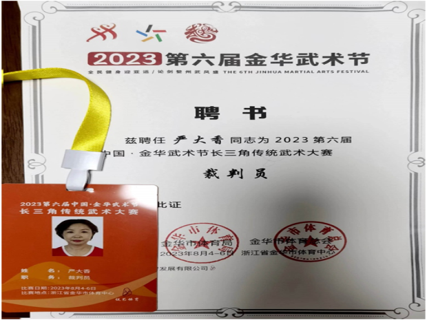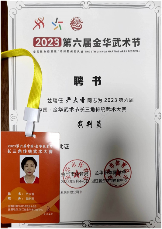 苏州市老年大学太极拳社的严大香老师被大赛组委会聘请为此次武术大赛的裁判员。